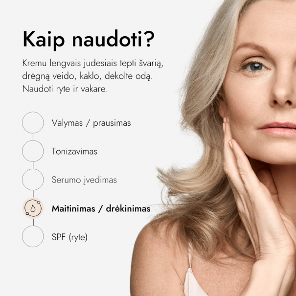 • Kofermentas Q10 – plačiai žinomas ingredientas, kuris padeda „kovoti“ su: smulkiomis raukšlelėmis, suglebusia oda, drėgmės ar spindesio trūkumu. Tai nepakeičiamas ingredientas brandžios odos priežiūrai.